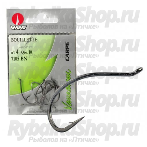 Одинарные крючки от французской фирмы VMC 7105 BN - это еще одно предложение компании для карповой рыбалки. Как и необходимо в данном виде ловли эти крючки обладают высокой прочностью, а также хорошей остротой и зацепистостью. Крючки выполнены из стали легированной ванадием, что значительно повышает их прочность. Заточены они с помощью метода запрессовки конуса (needle cone), что положительно сказывается на остроте и прочности. Покрытие крючков антикоррозионное Black Nickel. Ушко крючков 7105 BN отогнуто.