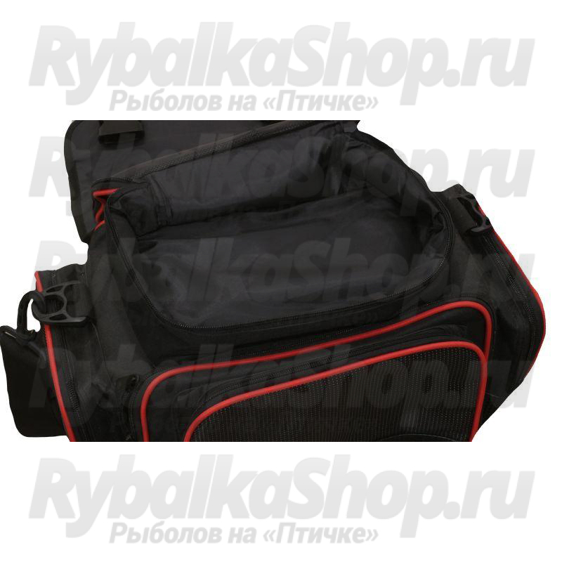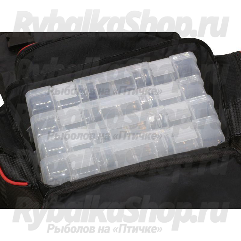 В основном отделении располагаются четыре пластиковых коробки для приманок размером 27 х 18 х 4,5см. с тремя отделениями пятнадцатью съемными перегородками. Сумка имеет четыре небольших внешних кармана на молнии - 2 по бокам сумки, 1 спереди и 1 сверху сумки.