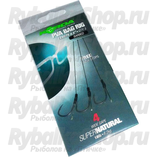 Korda PVA Bag Rig – 3 готовых оснастки связанных специально для ловли с ПВА мешками. Изготовлены на основе материала Korda SuperNatural. Длина каждого составляет 4.5" (11,43 см.). На одном конце поводка привязывается крючок Wide Gape, обжатый термоусадочной трубкой, что улучшает качество засечения. На другом конце связана классическая петля, которую можно привязывать к монтажу как самостоятельно, таки с использованием вертлюга. В комплекте с оснастками кладется блистер стопорков различной формы.