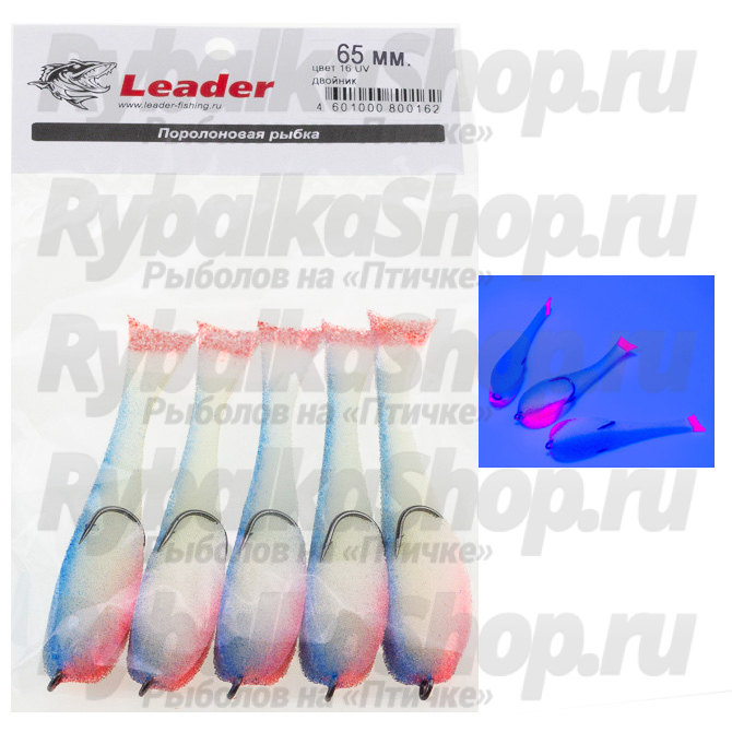 Рыбка поролоновая Leader оснащенная на двойнике 65 мм. Цвет 16 UV упак. 5 шт.