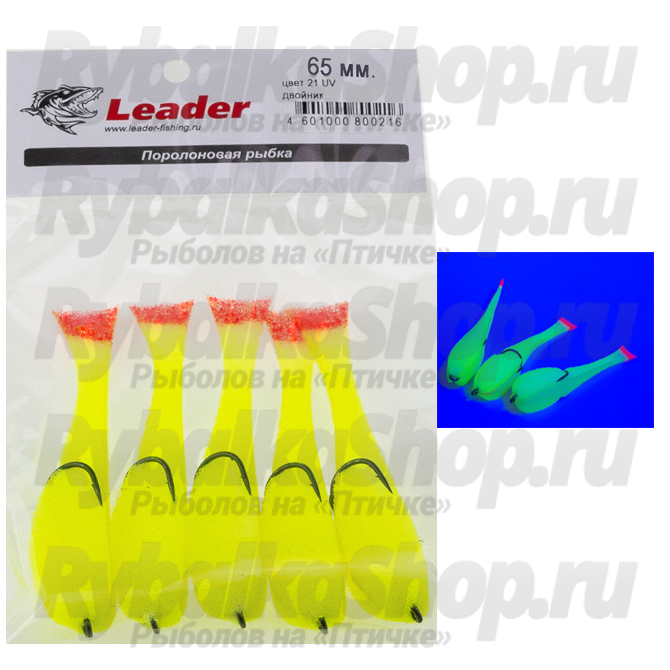 Рыбка поролоновая Leader оснащенная на двойнике 65 мм. Цвет 21 UV упак. 5 шт.