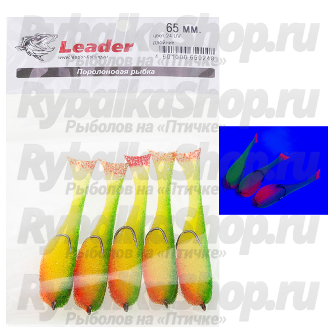 Рыбка поролоновая Leader оснащенная на двойнике 65 мм. Цвет 24 UV упак. 5 шт.