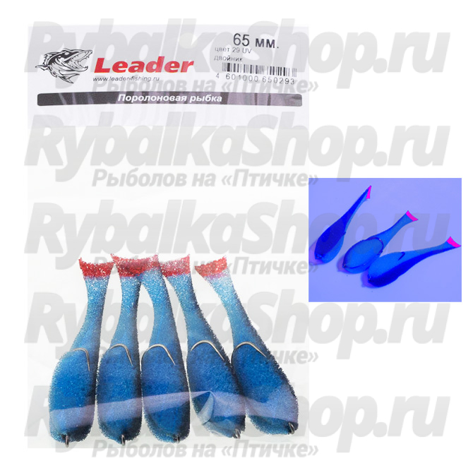 Рыбка поролоновая Leader оснащенная на двойнике 65 мм. Цвет 29 UV упак. 5 шт.