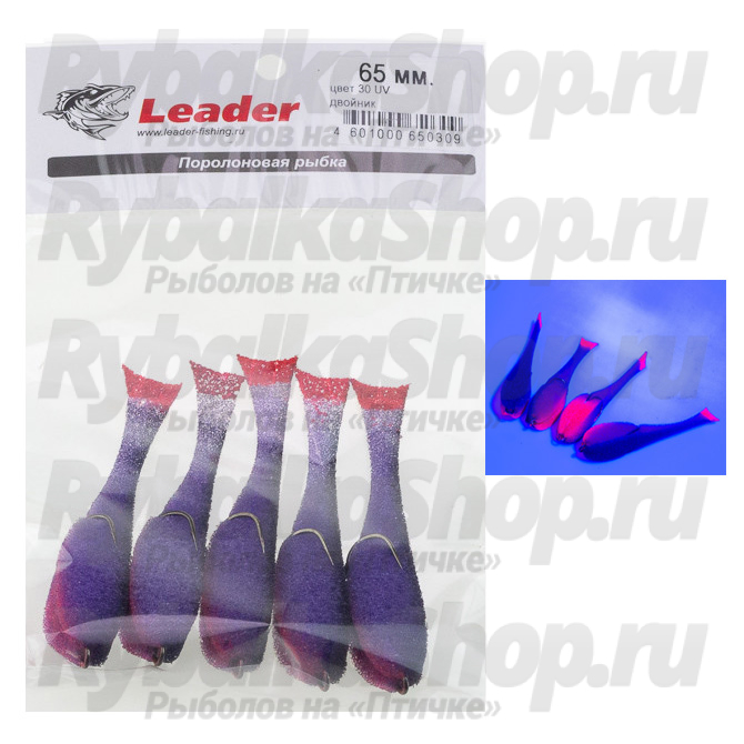Рыбка поролоновая Leader оснащенная на двойнике 65 мм. Цвет 30 UV упак. 5 шт.