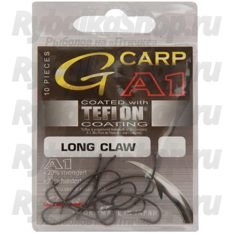 Gamakatsu G-Carp A1 Long Claw T/C - популярная модель одинарного крючка, которая с успехом используется в карповых монтажах c использованием термоусадочной трубочки. Крючок выполнен из высокопрочной стали с тефлоновым покрытием, которое улучшает проникающую способность.