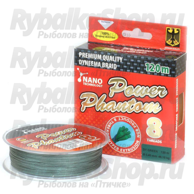 Плетеные шнуры Power Phantom 8x изготавливаются из волокон высокомодульного полиэтилена Dyneema SK 65 и имеет очень плотное, восьмижильное плетение и круглое сечение. Благодаря этому плетенка обладает удивительной прочностью и износоустойчивостью, а также имеют гладкую поверхность и очень низкий коэффициент трения, что облегчает скольжение по внутренней поверхности кольца и повышает дальность заброса. Леска обладает высокой чувствительностью, простотой в управлении и легкостью при вываживании. Оригинальная технология плетения предотвращает спутывание нити во время эксплуатации. Прочный и мягкий шнур обладает отличной устойчивостью к нагрузкам, легко вяжется и отлично держит узел.