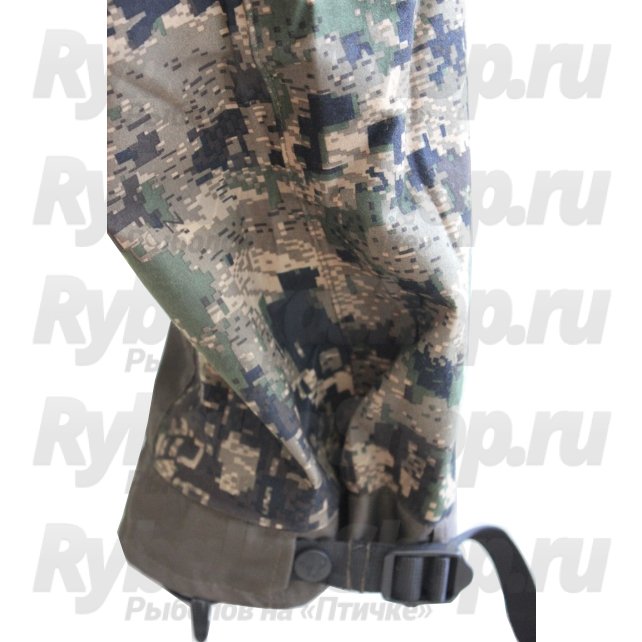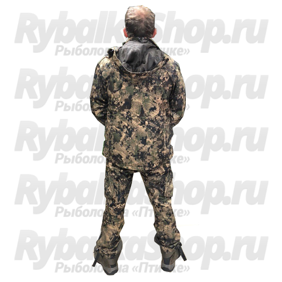 Костюм подходит практически для любой погоды, защищает от ветра и дождя, хорошо отводит влагу от тела и сохраняет тепло. Качественная обработка ткани обеспечивает сохранения цвета камуфляжа даже после многочисленных стирок и долгого нахождения под солнцем. Брюки имеют удобные манжеты, которые можно заправить в обувь. Они защищают от натирания, мозолей, а также не позволяют забраться вовнутрь насекомым. Карманы и съемный капюшон — дополнительные плюсы этого костюма.