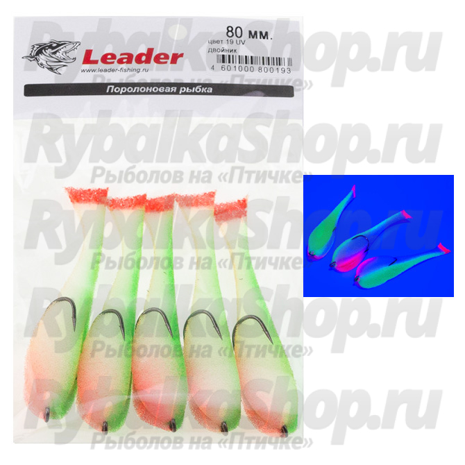 Рыбка поролоновая Leader оснащенная на двойнике 80 мм. Цвет 19 UV упак. 5 шт.