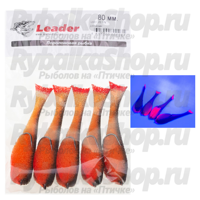 Рыбка поролоновая Leader оснащенная на двойнике 80 мм. Цвет 26 UV упак. 5 шт.