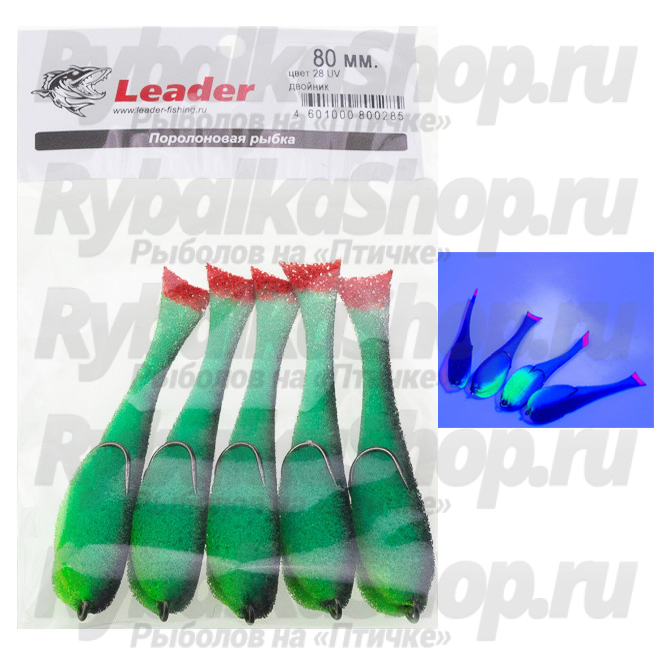 Рыбка поролоновая Leader оснащенная на двойнике 80 мм. Цвет 28 UV упак. 5 шт.