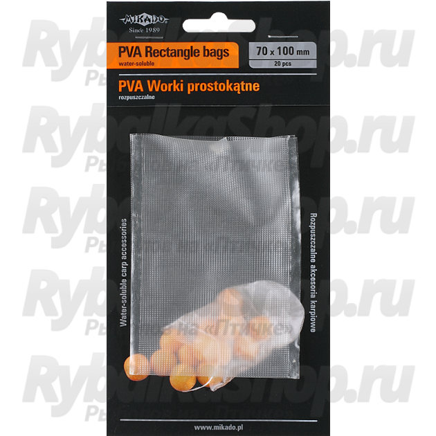 Пакеты ПВА Mikado прямоугольные для прикормки. Выпускаются в двух размерах, упаковкой по 20 штук.