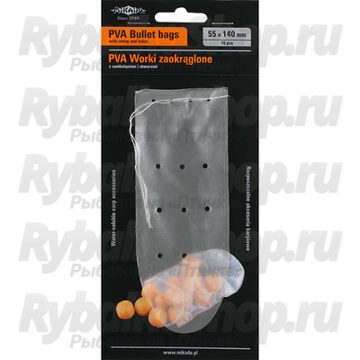 Пакеты ПВА Mikado округлые, с затяжкой и отверстиями 10шт. 65х190мм (Арт.APV-BB 65x190SH)
