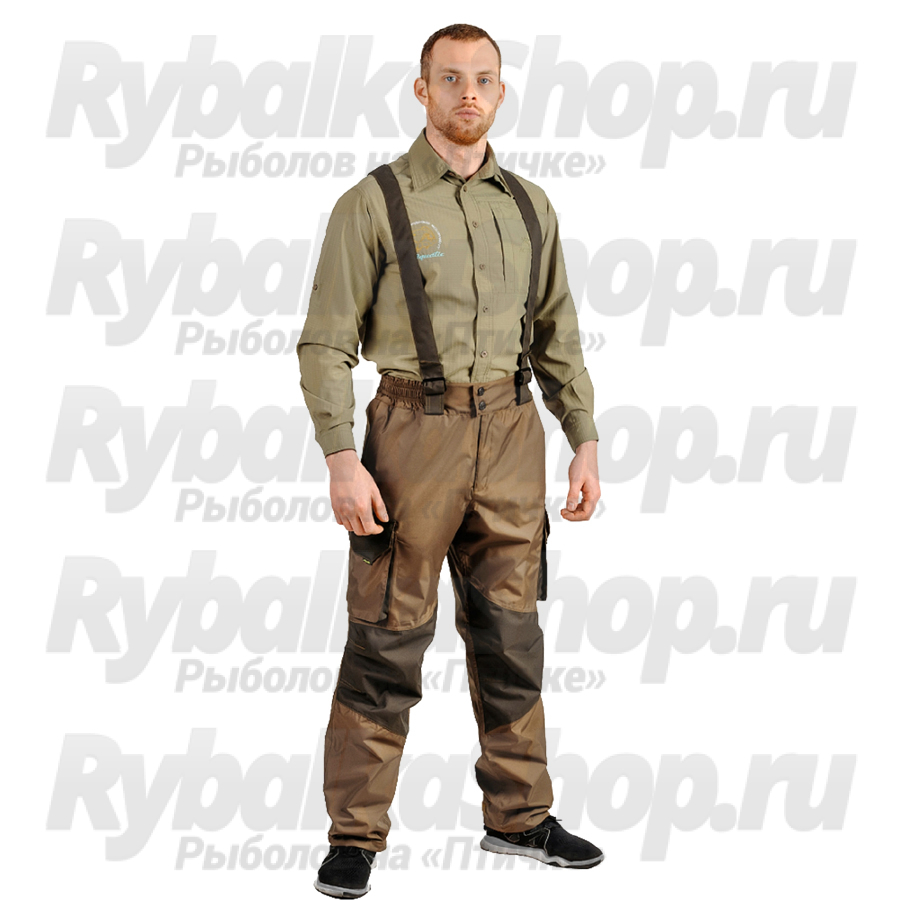 Брюки эргономичного стильного кроя не сковывают движения. Два врезных боковых кармана, два набедренных накладных кармана с клапанами на магнитных застёжках. Пояс с двумя пуговицам, широкой вшивной резинкой и высокой уплотнённой задней частью. В комплекте с брюками идут съёмные регулируемые подтяжки с широкой резинкой. Нижний проём брюк регулируется патами на липучке. Водонепроницаемость и пароиспаряемость — 10000/10000. Рекомендуемый температурный режим от -5 до +10 °C.