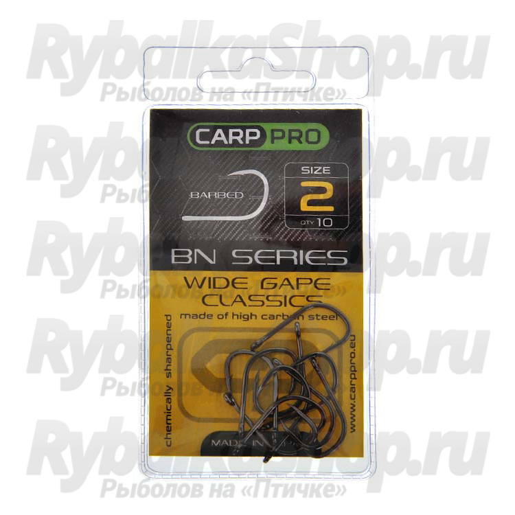 Carp Pro Black Nickel Wide Gape Classics — серия карповых крючков классической формы, с широким зевом для всех видов и типов насадок. Используется как с термоусадками и лентяйками, так и без них. Материал крючка — особо прочная, высокоуглеродистая сталь. Благодаря японской технологии химической обработки жала, крючок всегда очень острый. Кончик жала слегка изогнут, что обеспечивает отличную засечку.