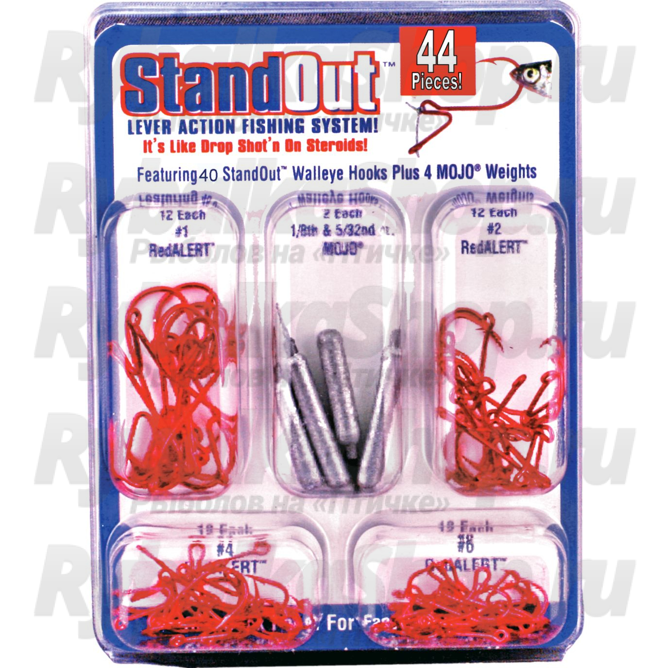 Набор крючков Stand Out Drop-Shot Kit для ловли дропшот. В набор входит 40 крючков четырех размеров и четыре груза. Дропшот – это эффективная снасть, направленная на ловлю хищных и некоторых травоядных рыб с глубины или в тех местах, которые находятся близко к берегу. Ей ловят щук, судаков, окуней, карасей. Крючок Stand Out - прочный и надежный, с остро заточенным жалом.
