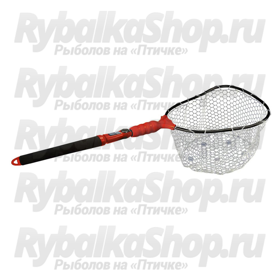 Место стыка обруча и ручки имеет пластиковое покрытие - сетка не будет подвергаться абразивному воздействию острых граней и прослужит значительно дольше. Не тонущая телескопическая ручка раздвигается посредством нажатия на кнопку, которая располагается в ее верхней части.
