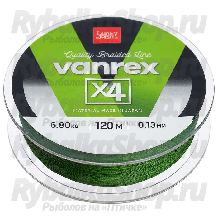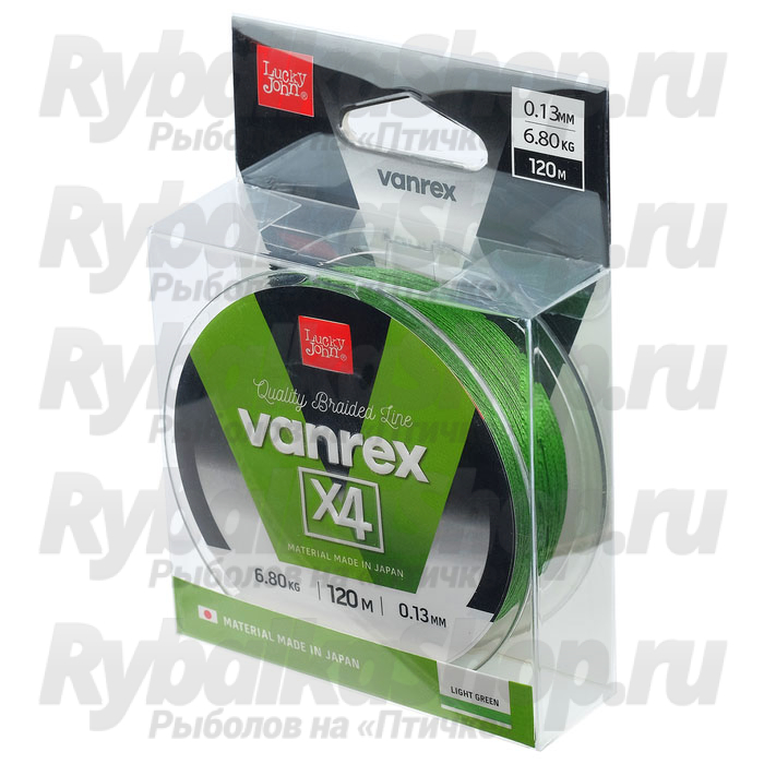 Lucky John Vanrex х4 Light Green - современный плетёный шнур универсального использования, сплетённый из четырех прядей высокомодульного полиэтилена (PE). Плотное плетение придаёт шнуру высокую прочность и всесезонное использование. Шнур поставляется в оптимальной спиннинговой размотке – 120 м. Цвет зелёный.