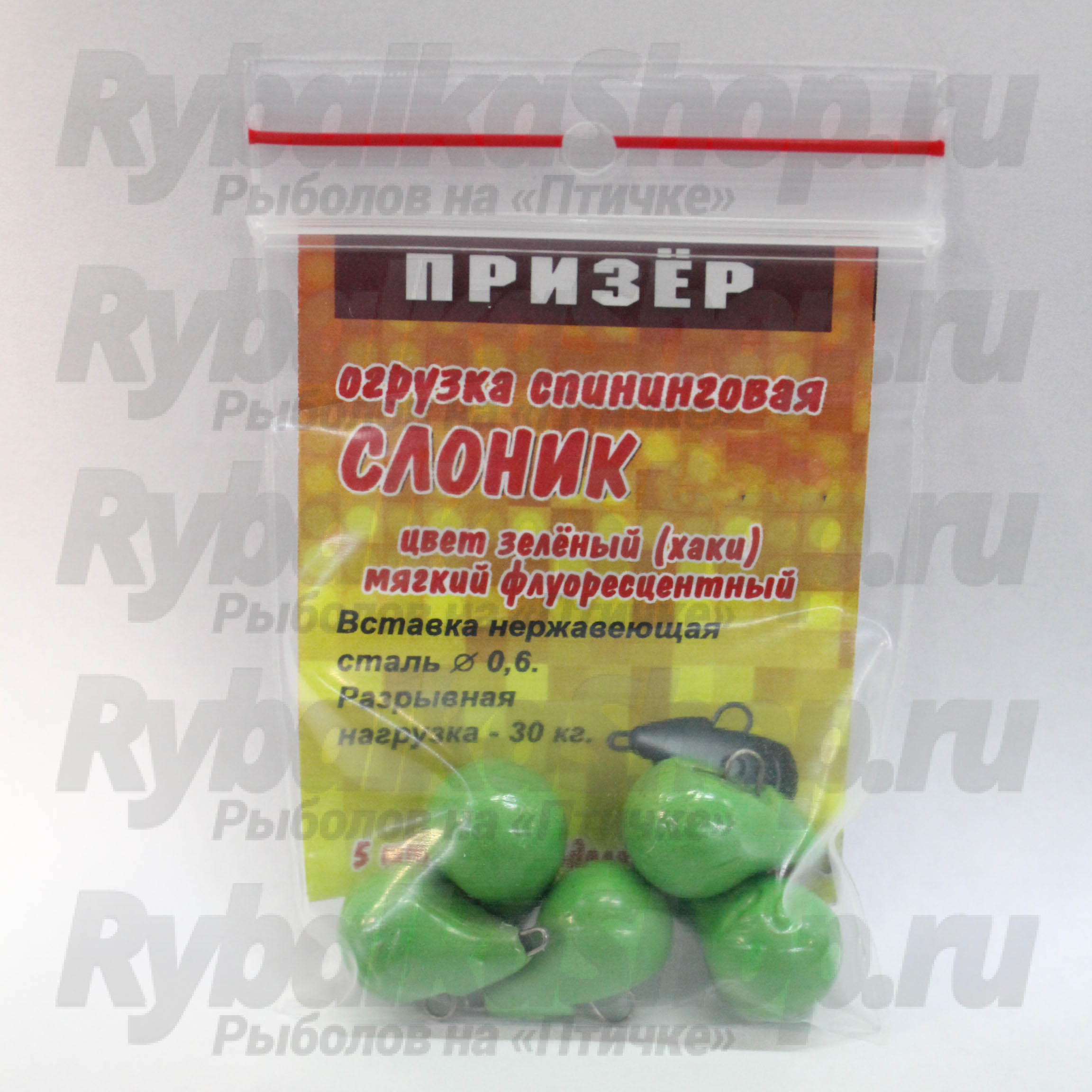 Груз ПРИЗЁР "Слоник" зеленый мягкий флюр предлагается в широком диапазоне веса: от 5 до 50 грамм. Разборные грузы применяются для оснасток с офсетными и двойными крючками.