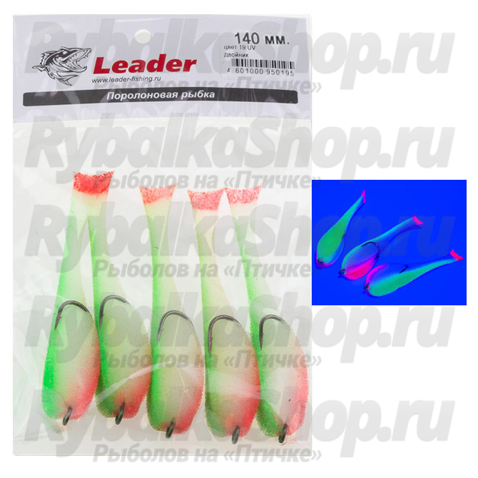 Рыбка поролоновая Leader оснащенная на двойнике 140 мм. Цвет 19 UV упак. 5 шт.