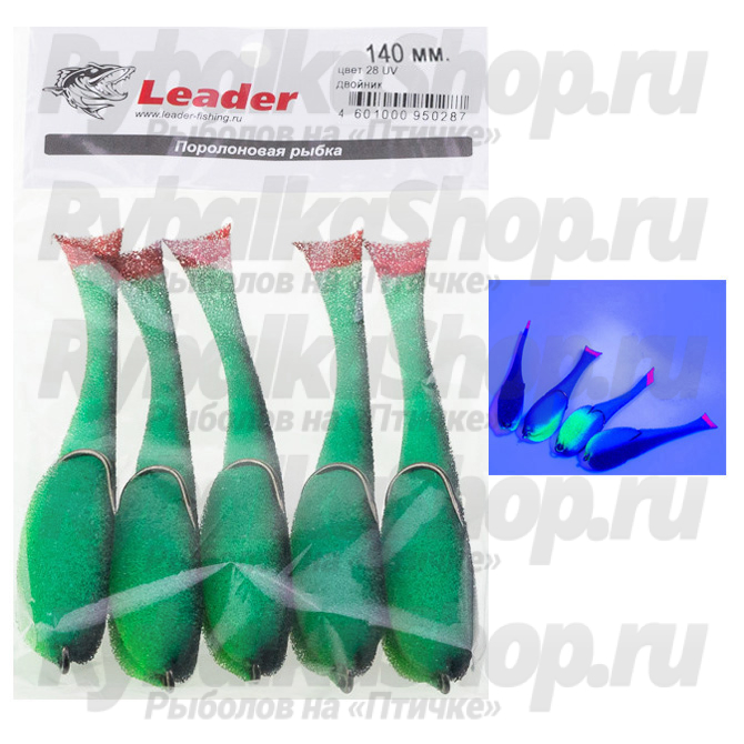 Рыбка поролоновая Leader оснащенная на двойнике 140 мм. Цвет 28 UV упак. 5 шт.