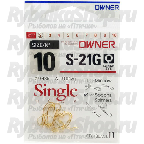 Серия крючков Owner 51562 S-21G рекомендована для оснащения различных типов блесен, в том числе, и для отвесного блеснения. Крючки характеризуются крепежным колечком большого диаметра, удлиненным цевьем, широким чуть скошенным круглым загибом, миниатюрной бородкой. Крючки имеют стойкое золоте покрытие (Gold).