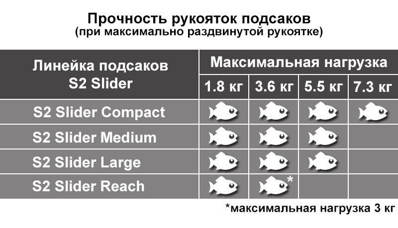 EGO S2 Slider - линейка подсаков американского производства. Конструкция подсака включает в себя обруч из анодированного алюминия с установленной сеткой из чёрной резины, а так же телескопическую ручку, выполненную из пластика и анодированного алюминия. Подсачек крепится к ручке посредством резьбового соединения.