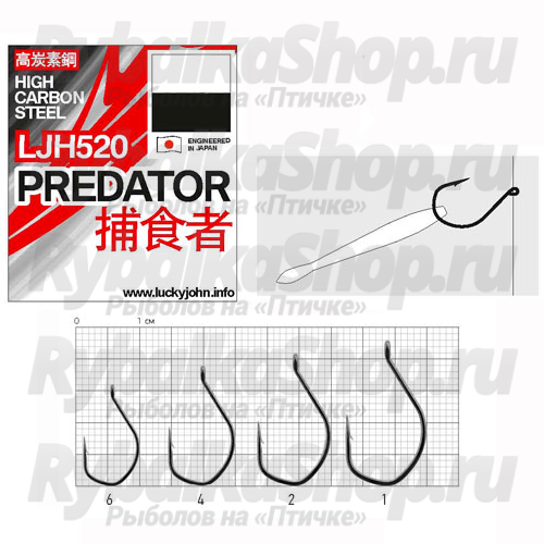 Lucky John Predator LJH520 – одинарные японские крючки, предназначенные для использования в оснастке «дроп-шот». Крючки изготовлены из высококачественной, углеродистой, легированной стали. Они обладают повышенной устойчивостью к разгибанию. Электрохимическая заточка жала крючка, антикоррозийное покрытие и лазерный контроль качества обеспечивают отличные рабочие характеристики данной модели крючков.