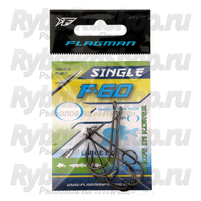 Flagman Single F-60 — серия крючков с двумя дополнительными насечками на внешней стороне цевья. Насечки (бородки) созданы специально для фиксации приманки. Благодаря такой зацепистости приманка с крючка никогда не слезет и не сорвется даже при самом агрессивном клеве хищника (окуня, судака или щуки).