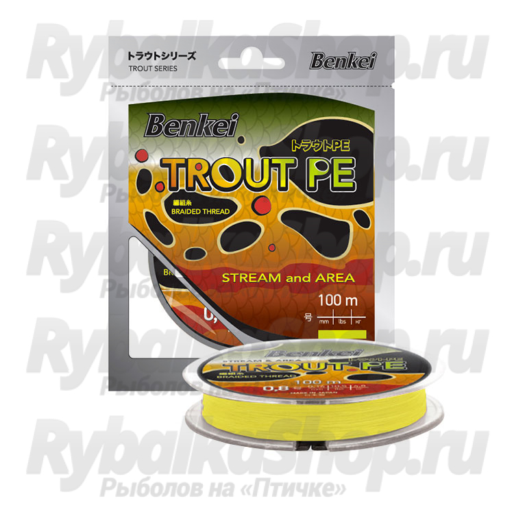 Benkei Trout PE – плетеный шнур, предназначенный для ловли форели. Качественное сырье и сверхплотное плетение микроволокон обеспечивает практически нулевую растяжимость и сверхчувствительность даже к осторожным поклевкам на любой дистанции ловли. Шнуры имеют малые диаметры, они очень гладкие и мягкие. Это позволяет осуществлять дальние забросы даже ультралайтовыми приманками. Яркая флуоресцентная расцветка позволяет визуально контролировать проводку. Леска отлично подойдет как для ловли дикой форели в реках, так и для ловли прудовой форели. Шнур желтого цвета, поставляется в намотке по 100 метров.