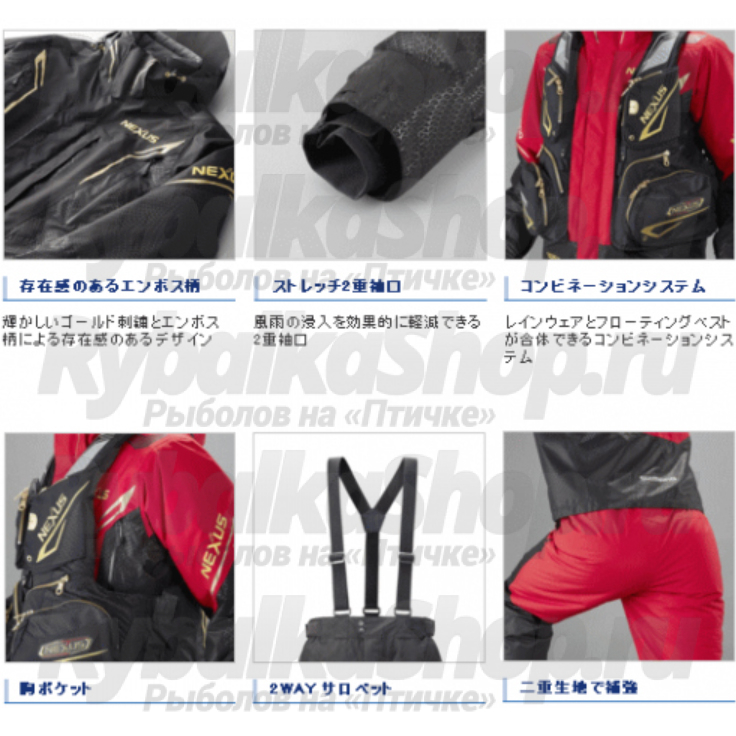 Костюм Shimano Nexus RB-119T имеет анатомический крой, который не сковывает движения во время активной рыбалки. Передняя часть куртки оснащена молниями для крепления спасательного жилета (только Shimano Nexus). Рукава имеют двойные манжеты которые предотвращают попадание ветра и дождя внутрь костюма. Трикотажная подкладка на воротнике.