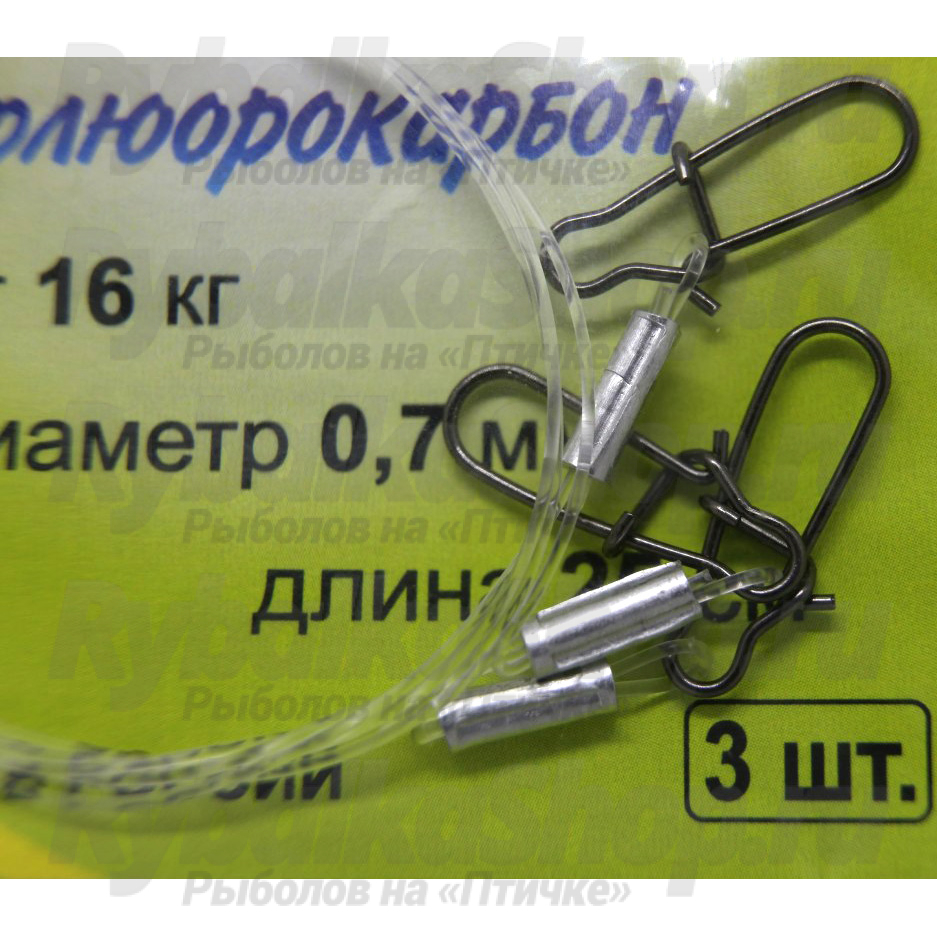 Поводки оснащены надёжной фурнитурой из прочной и упругой стали, а для качественного кремпирования поводка используются алюминиевые обжимные трубки.