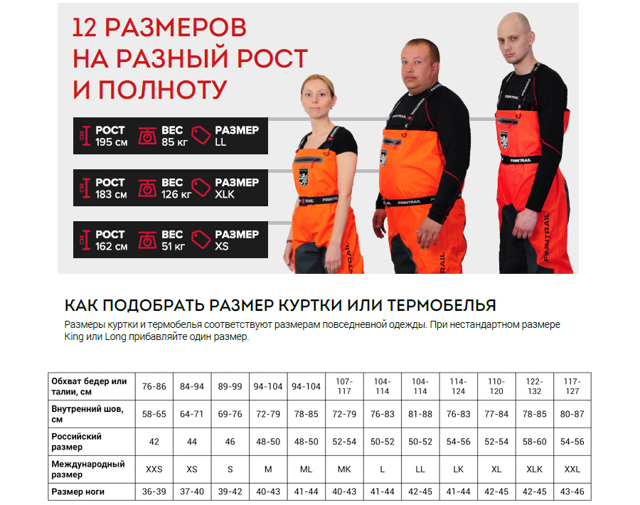 Куртка Finntrail Storm оснащена кулисой внизу для подгонки по фигуре, страховочными кольцами для крепления чеки, светоотражающими элементами для обеспечения безопасности в темное время суток. Брюки имеют два больших накладных набедренных кармана, регулировку объёма по низу брюк. Колени имеют 3D форму и не ограничивают в подвижности. Брюки оснащены высокой тёплой спинкой с подтяжками, регулируемыми по длине. Все швы и молнии костюма герметично проклеены.