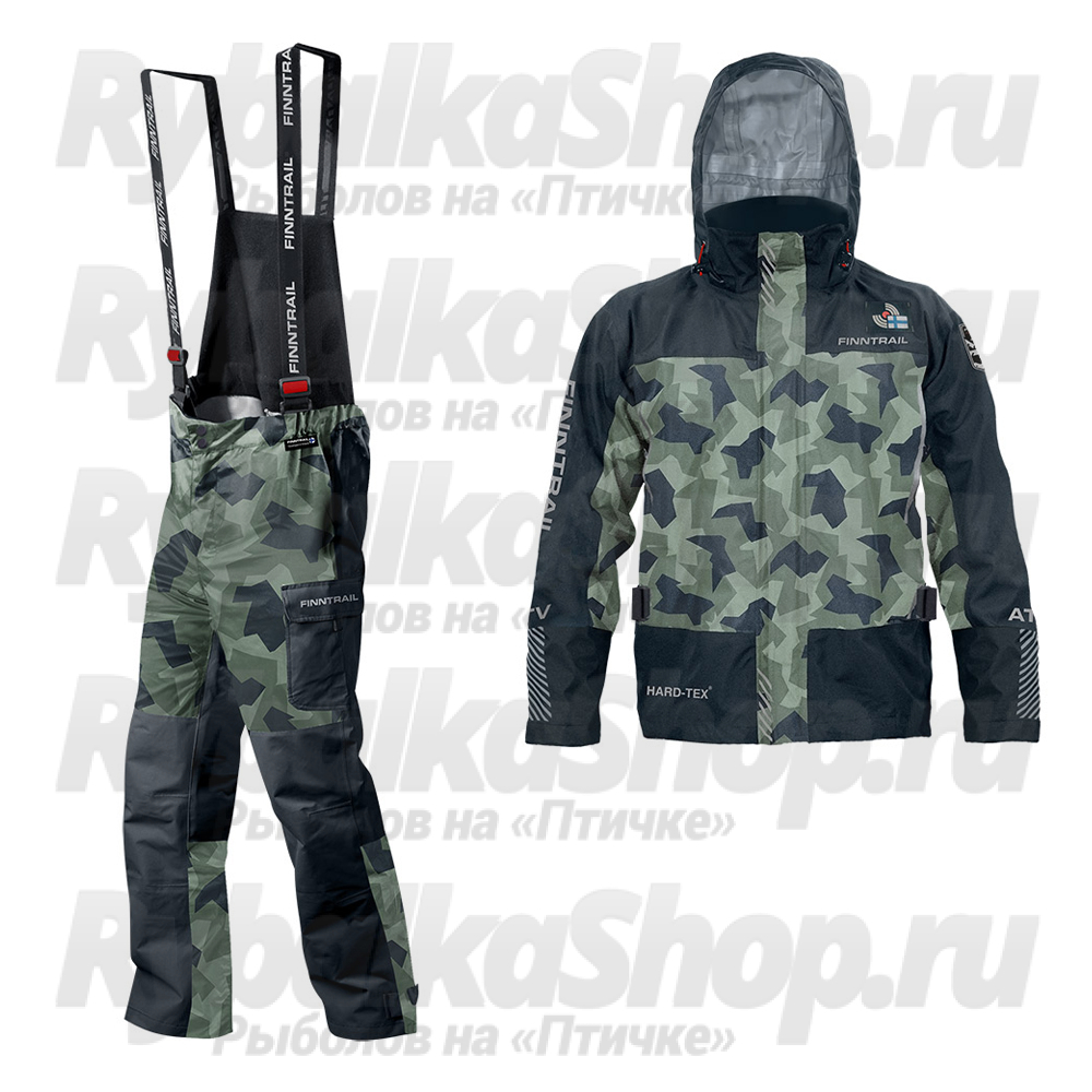 Костюм Finntrail Storm 3415 CamoArmy_N из трехслойной мембранной ткани «HARD-TEX» (15000 мм \ 7000 г./м2/24ч) с высокой степенью защиты от воды и грязи, предназначенный для любых погодных условий. Куртка имеет отстёгивающийся капюшон, регулируемый по объёму в двух плоскостях, два внутренних кармана с влагозащитными молниями и два внешних нагрудных кармана с влагозащитной тракторной молнией, устойчивой к попаданию грязи. Центральная двухзамковая влагозащитная тракторная молния, устойчива к грязи и защищена клапаном с магнитной системой застежки. Куртка имеет комфортный флисовый ворот. Рукава снабжены плотно прилегающими манжетами из прорезиненного материала, препятствующими затеканию воды в рукава.