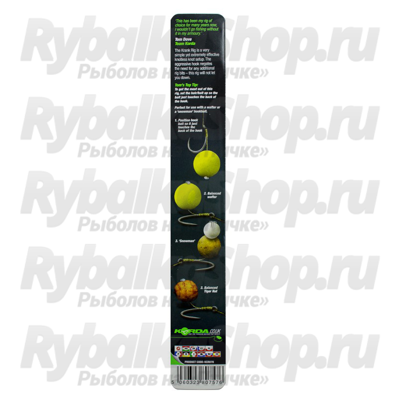 Поводок готовый Korda Krank Ready Rig рекомендуется использовать с тонущими или сбалансированными, медленно тонущими насадками. Крючок Korda Krank, используемый в оснастке, заслуживает отдельного внимания. Сочетание бритвенно острого жала и особой формы загиба позволило добиться невероятно высокой реализации поклевок, а так же свести к нулю шанс схода рыбы во время вываживания.