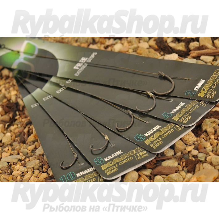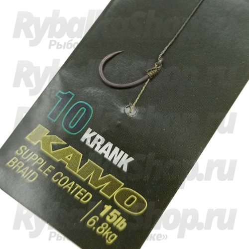 Используемый поводковый материал Kamo отличается высокой жесткостью оболочки и мягким плетеным сердечником. К очищенной части оболочного материала привязан крючок, из этой же части связан и волос, на который крепится бойл. Жесткая часть отвечает за отличное поведение во время заброса, ровное расположение на дне, а так же отличную сенсорику. Камуфляжная расцветка поводка позволяет замаскировать оснастку на фоне дна, что как правило положительно сказывается при ловле крупной, осторожной рыбы. Карповый поводок используется в основном для ловли на маленькие и среднего размера бойлы.
