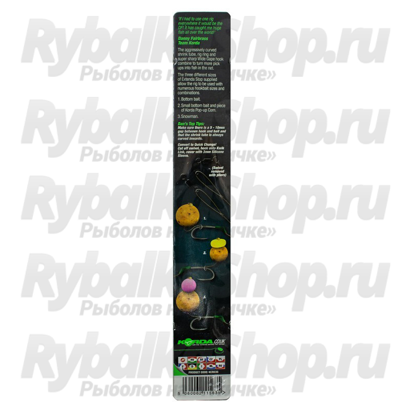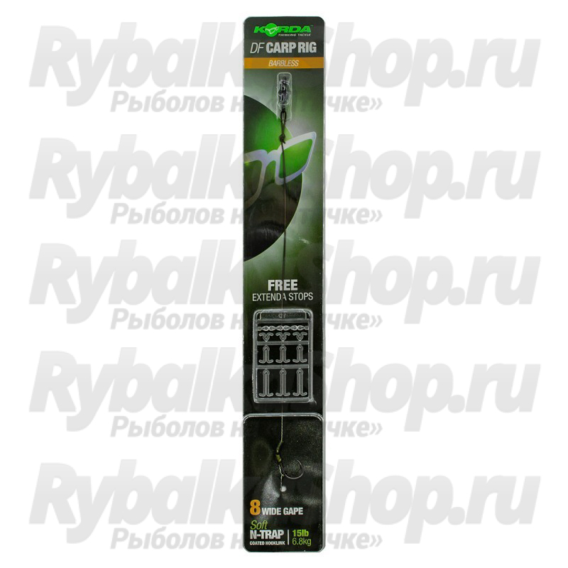 Korda N-Trap DF Rig Barbless Wide Gape - готовые, аккуратно связанные версии поводков, которые Дэнни Фэйрбрэсс использует для большинства случаев ловли карпа. Поводки DF Rig выполнены из материала N-Trap Soft и оснащены безбородыми крючками Wide Gape, поставляются со стопорками Extenda разных размеров в упаковках.