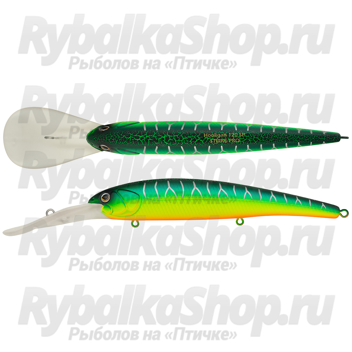 Глубоководный воблер Hooligan Deep Diver - одна из последних разработок экспертов Strike Pro. По форме Hooligan Deep Diver является классическим минноу, который копирует реалистично прогонистую рыбешку. Габариты его 12 см, масса составляет 20,9 гр. Предназначена модель для трофейной охоты за зубастой щукой, судаком и сомом, что держатся на большой глубине. Погружается воблер на 6 - 8 м. Он обладает стабильной выразительной, дразнящей игрой на любой скорости анимации. "Оживает" модель на простой равномерке. Высокочастотные колебания корпуса создают мощные возмущения среды.