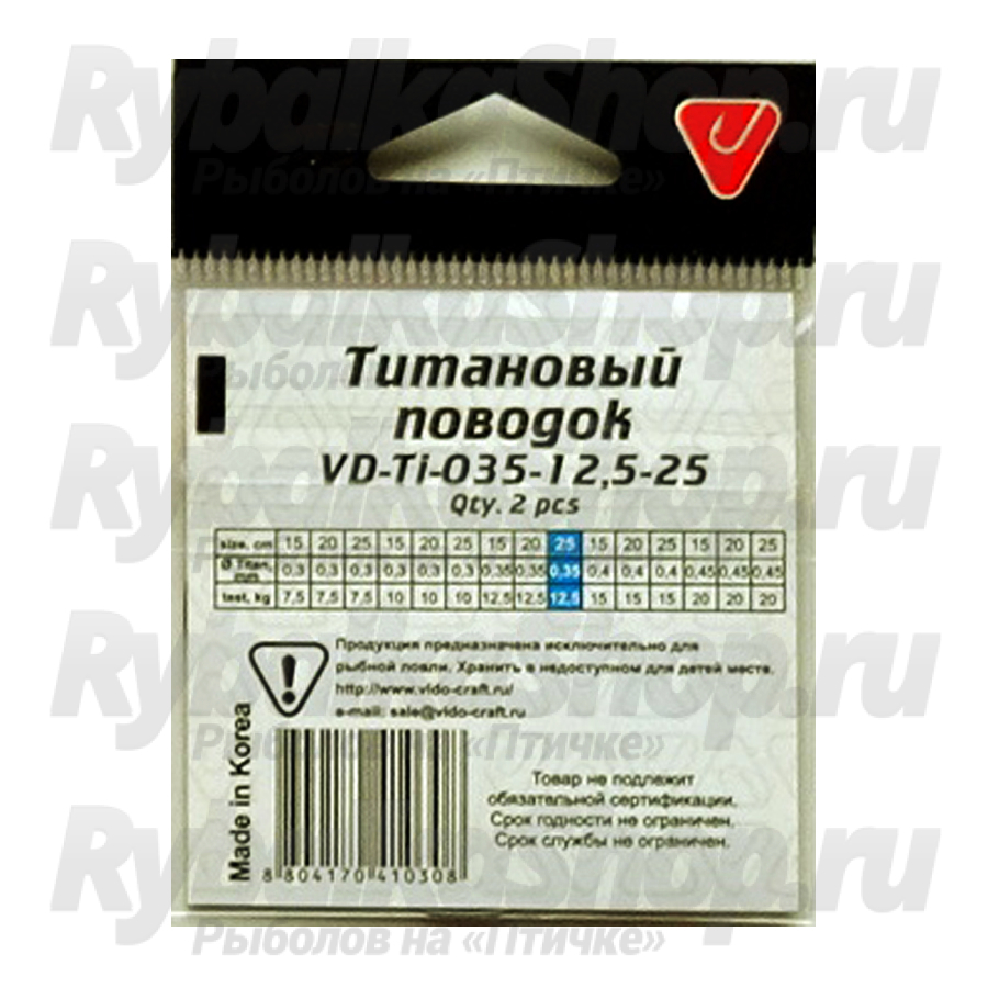Титановые поводки Vido Craft VD-Ti (15 - 25 см) изготовлены из никель -титанового сплава, восстанавливающего первоначальную форму после нагрузки и деформации, очень надежны и долговечны. Vido Craft VD-Ti имеют 15 типоразмеров по тесту прочности, диаметру жилы и длине.