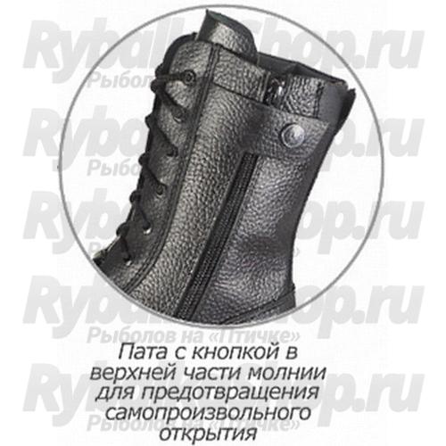 Для того чтобы ботинки можно было быстро снять или одеть предусмотрена с внутренней стороны спиральная пластиковая молния. Для ее фиксации, поверх, на верхней части голенища, предусмотрен хлястик на кнопке.
