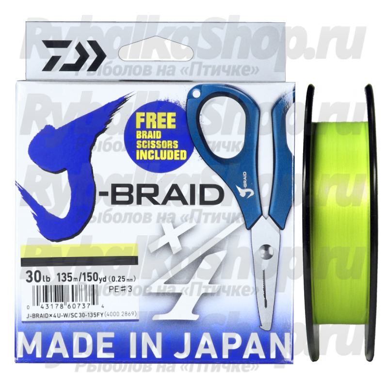 Daiwa представляет набор Daiwa J-Braid X4E-W/SC 135m Yellow, в который входит леска J-Braid X4 цвет Желтый в размотке 135 метров и ножницы Daiwa J-Braid Scissor.