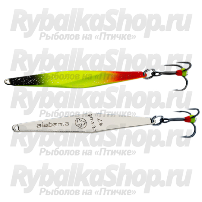 Sprut Alabama #9 (90mm/15g) — классическая блесна вытянутой формы, которая в первую очередь подходит для ловли судака, берша и крупного окуня. При резких взмахах блесна характерно осыпается, а при средних уходит в сторону от оси на небольшое расстояние. На блесну установлен увеличенный тройник-капля, который дает точку атаки хищника и предупреждает сход рыбы.