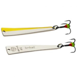 Среди зимних приманок от бренда Sprut есть серия блесен под названием Kriket. Это небольшая колебалка весом 3 грамма. Длина ее корпуса составляет 50 миллиметров. Ловить на такую приманку лучше всего на непроточных водоемах, но можно и на реках со слабым течением. Самые хорошие результаты она принесет с неглубоких участков, где можно охотится на окуня или молодь рыб покрупнее.