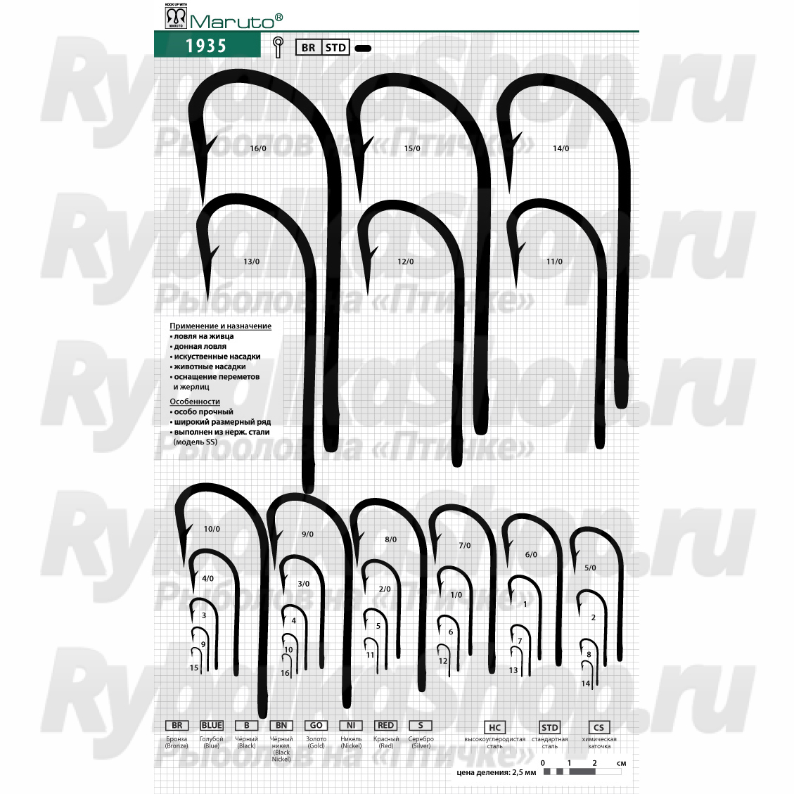 Крючки Maruto 1935 BR применяются для ловли на живца, для донной ловли, для искусственных насадок, для животных насадок, а также для оснащения жерлиц.