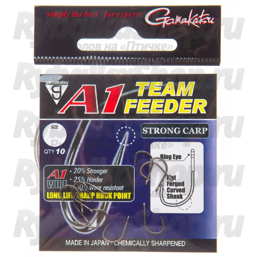 Gamakatsu A1 Team Feeder Strong Carp – отлично подходят для карповой ловли с использованием волосяных оснасток с такими насадками как кукуруза, небольшие бойлы или пеллетс. Большая упругость толстой проволоки в сочетании с классической формой крючка и коротким цевьем обеспечивает достаточную прочность для удержания даже крупной рыбы.