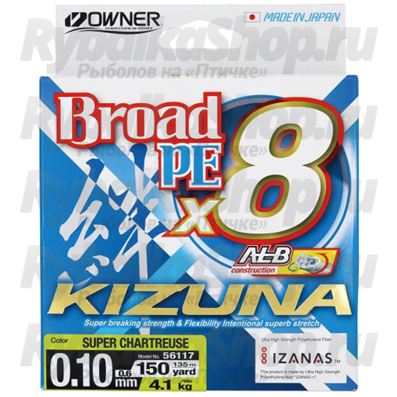 Owner представляет плетеный шнур высочайшего качества – Kizuna Broad PE x8. Инновационная технология плетения Anti Loosen Braided Construction позволила достичь невероятно гладкой поверхности и минимального сопротивления шнура во время заброса. Чрезвычайно прочные микроволокна Izanas обеспечили шнуру Owner Kizuna Broad PE x8 повышенную устойчивость к истиранию и деформации. Также уменьшился его вес, что положительно повлияло не только на дальность, но и на точность заброса. Передовая технология плетения ALB из 8 микроволокон сделала этот шнур универсальным: он может использоваться как в спиннинговой, так и в морской ловле. Широкий диапазон диаметров позволяет легко подобрать Kizuna Broad x8 под ваши условия ловли. Выпускается в наиболее востребованных размотках и цветовых решениях.