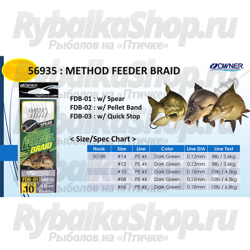 Крючки Owner FDB-01, для карпфишинга и другой мирной рыбы, с готовым поводком, для облегчения монтажа при фидерной ловле на берегу водоемов и экономии времени. Эти крючки с поводком предназначены для монтажа по типу Feeder Method в Карпфишинге, с готовой фиксацией для удерживания наживки на волосе монтажа возле крючка. Что облегчает и экономит время при наживлении насадки на монтаж. Монтаж волоса предназначен для фиксации донных бойлов и пеллетса более жесткой структуры и большим временем растворимости в воде. Так же такой фиксатор ускоряет процесс наживления насадки на волос. Так как данного типа бойлы и пеллетс имеют твердую структуру и требуют усилий при наживлении. Длина поводков составляет 10 см, а диаметр лески с разрывной нагрузкой подобран под размеры крючков в соответствии с предполагаемыми нагрузками и размерами рыбы и ловли под тип монтажа Feeder Method.