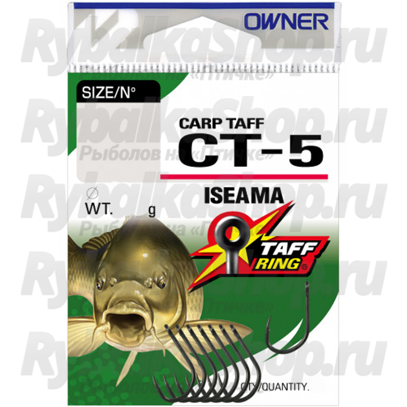 Крючок Owner Carp Taff Iseama teflon CT1-53275 изготовлен из толстой проволоки, с матовым черным покрытием, с игольной заточкой и нормальной длины цевьем. Особенность крючка — это заваренное колечко. Несмотря на то, что основная область применения крючков — спортивная карповая рыбалка, они, во многом благодаря широкой размерной линейкe, могут использоваться и при ловле других видов рыб, например, леща, линя, язя и др.