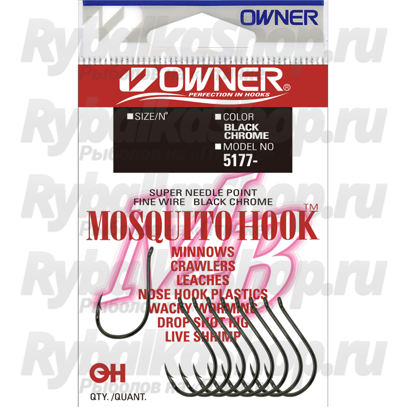 Owner Mosquito Hook 5177 – серия одинарных крючков, специально разработанная для спиннинговой ловли разнообразными поводковыми оснастками типа дроп-шот (drop shot), вэки (wacky), отводной и пр. Также крючки неплохо зарекомендовали себя в фидерной, поплавочной рыбалке и ловле на живца. Owner 5177 изготовлены из прочной высокоуглеродистой стальной проволоки. Owner Mosquito Hook характеризуются округлым загибом, кованым поддевом, средней длины цевьем, слегка отогнутым внутрь и в сторону жалом и стойким к коррозии защитным покрытием черного или красного цвета. Острейшее жало с идеальной заточкой и обычной величины бородка гарантируют эффективное засечение и удержание любой клюнувшей рыбы. Выпускаются в широком спектре размеров.