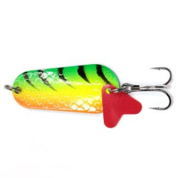 Пластина у блесны Namazu Squama толстая, потому массивная. Приманки дальнобойные и позволяют облавливать глубокие места. Среди потенциальной добычи, кроме популярных окуня и щуки, - жерех, крупные лососевые, берш. Лицевая сторона у данной модели покрыта фигурным рифлением, которое воспроизводит чешую. При блестящем окрасе оно способствует бликам. На кольце рядом с тройником закреплен небольшой лепесток. Такая яркая деталь вносит "изюминку" в игру и провоцирует хищника наброситься именно на крючок.