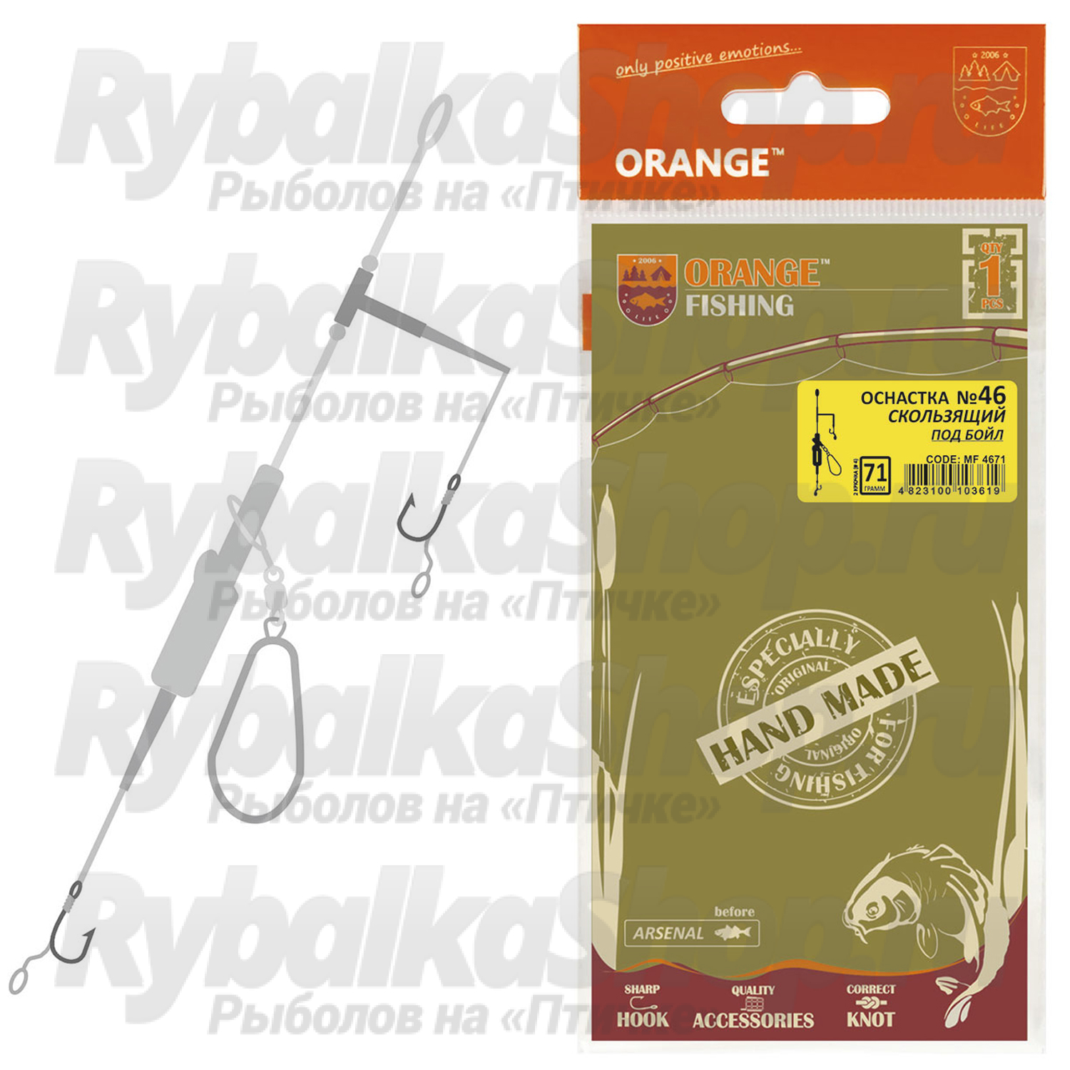Оснастка Orange #46 – оснастка для ловли карпа “Скользящая” на 2 крючка, под бойл. Изготовлена из высококачественных комплектующих: грузило ORANGE Lead Distance, карповый поводковый материал ORANGE Carpx8, лидкор (проклеенный) фирмы Ockert (Germany), крючки под бойл Kumho (Korea).